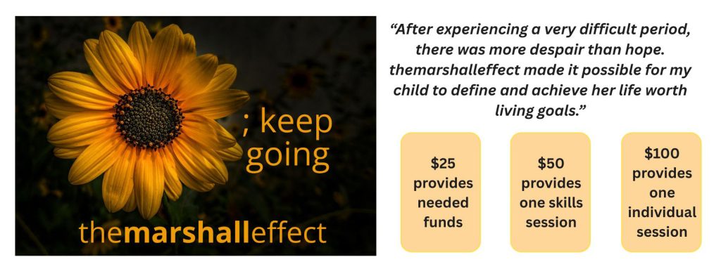Your donation to themarshalleffect will fund evidence based mental health therapy for individuals at risk of suicide.